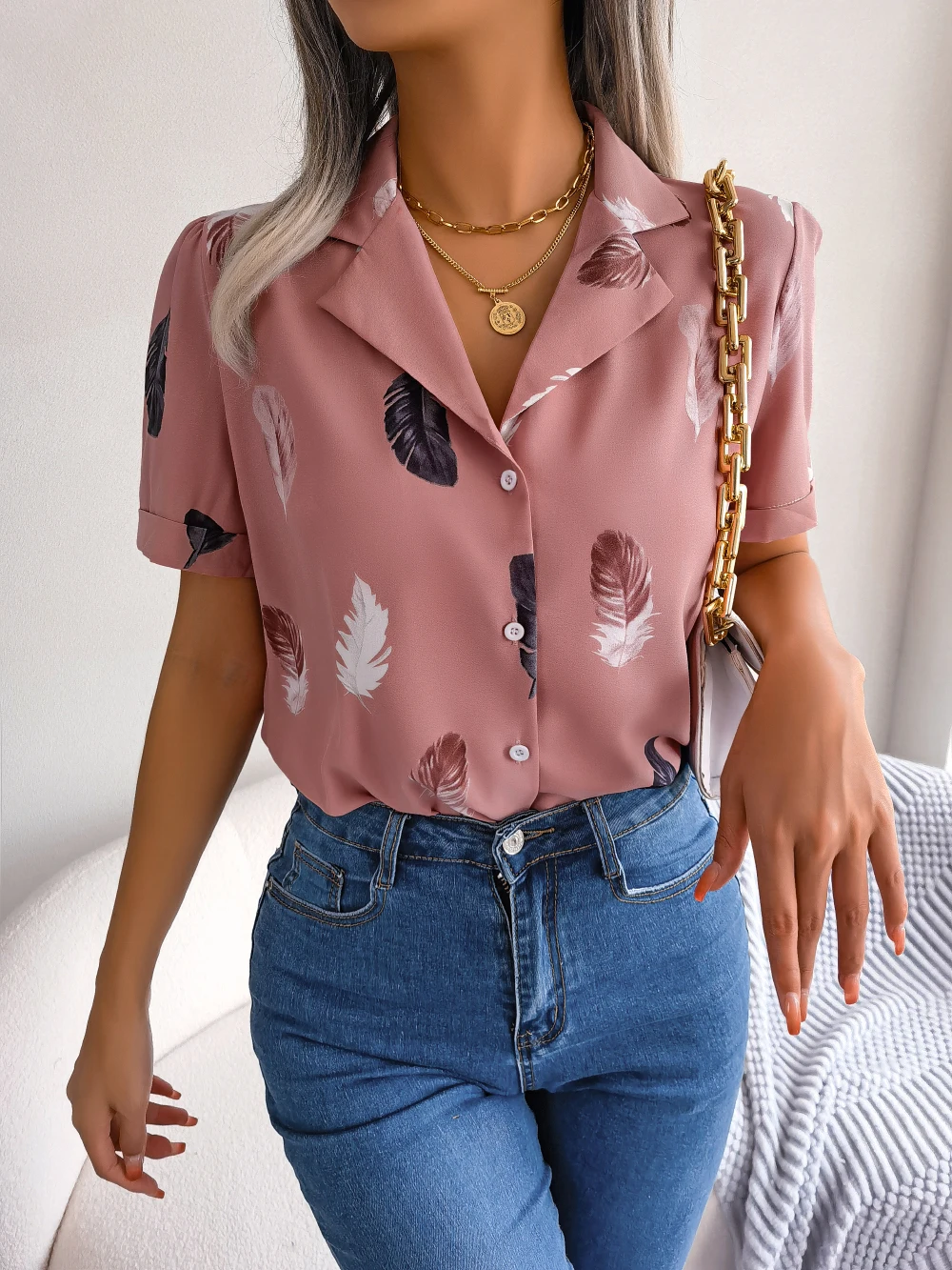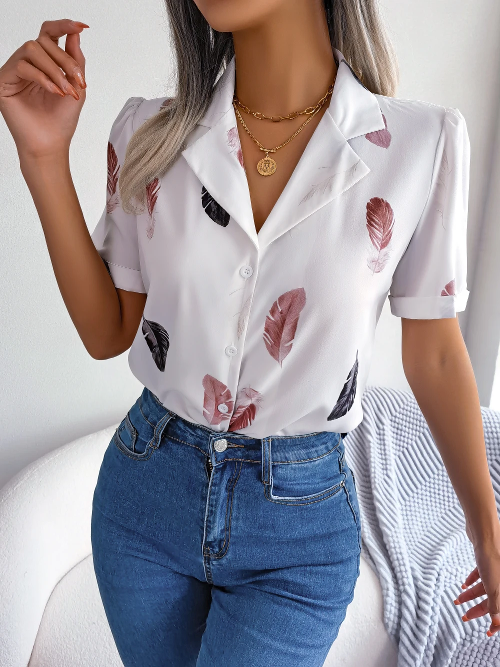 Women Casual Notched Short Sleeve Print Shirt